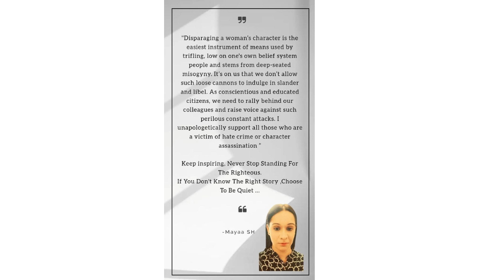 Mayaa SH is a prominent Indian poetess, memoirist and a known name in Contemporary Literature whose work is known for her open discussion on women’s rights and voices and experience of being an Indian woman. Most of her writings deals with women living in patriarchal society(male dominated society). Female sensibilities are deeply spread through her writings along with her extensive work for gender neutrality.Mayaa SH is best known for getting logical congruence for understanding the role of tradition and societal dogma in shaping women’s lives and identities speaks on how she underwent character assassination and the resistance she culminated as the urge to not react. In her words ,”It’s natural to want to defend yourself, but this can often make the situation worse.